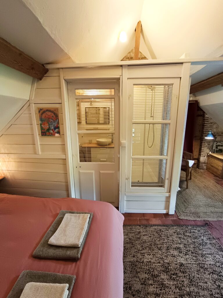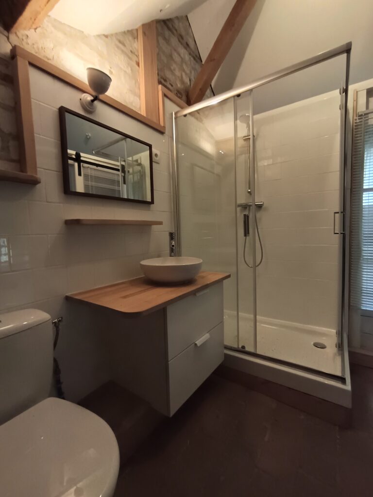 - Une salle d’eau avec grande douche cabine, sèche-cheveux et sèche serviettes électriques,